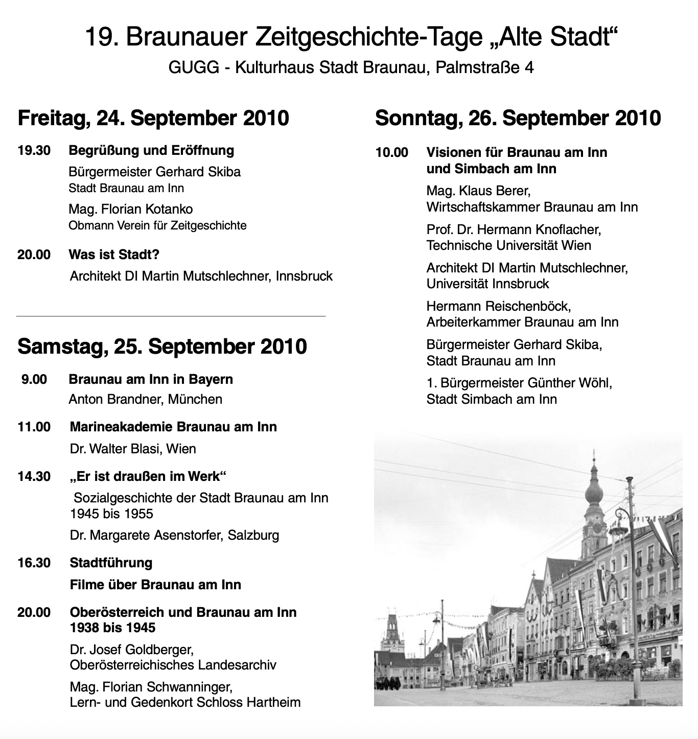 Vom 24. bis 26. September 2010 widmeten sich die 19. Zeitgeschichte-Tage im Kulturhaus GUGG der Geschichte und Zukunft Braunaus als "Alte Stadt" – vom mittelalterlichen Stadtbau über Sozial- und Verkehrsgeschichte bis zu heutigen Planungsfragen.