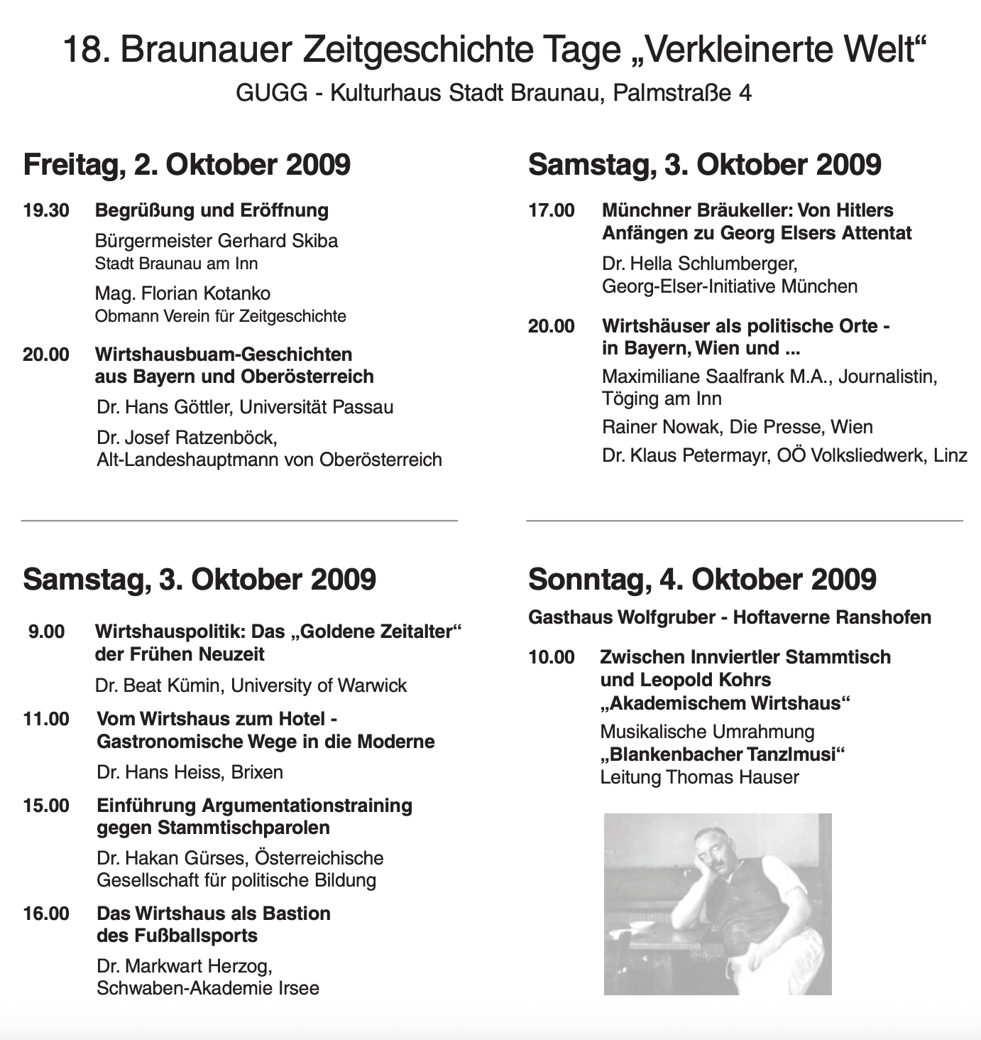 Vom 2. bis 4. Oktober 2009 standen die Braunauer Zeitgeschichte-Tage im Zeichen des Wirtshauses – als Ort der Politik, der Geselligkeit und der gesellschaftlichen Auseinandersetzung. Die wissenschaftliche Leitung lag bei Andreas Maislinger. Eröffnet wurde die Tagung von Gerhard Skiba, Bürgermeister der Stadt Braunau am Inn, und Florian Kotanko, Obmann des Vereins für Zeitgeschichte.