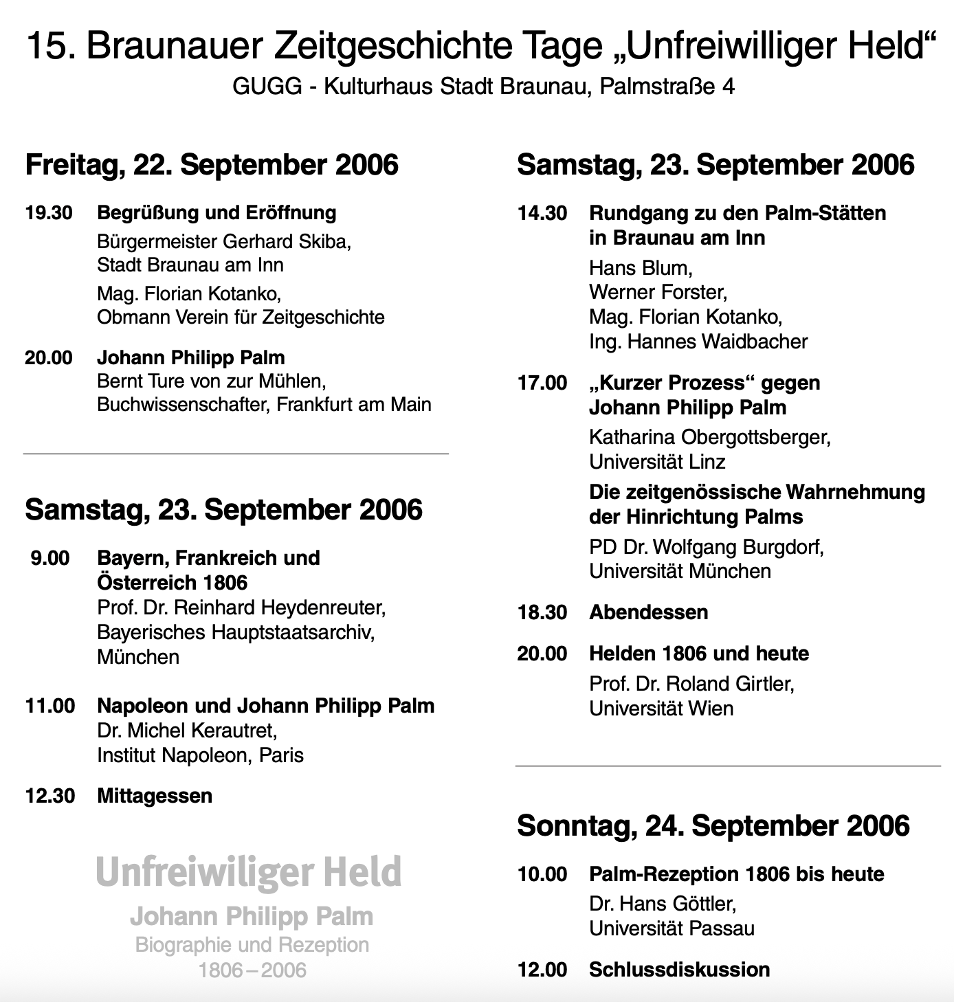 2006 rückten die Zeitgeschichte-Tage den Buchhändler Johann Philipp Palm in den Mittelpunkt: Biografie, Prozess und Hinrichtung in Braunau, die Schrift "Deutschland in seiner tiefen Erniedrigung", ihre Wirkung und Instrumentalisierung, dazu Rundgang und Ausstellung in der Herzogsburg.