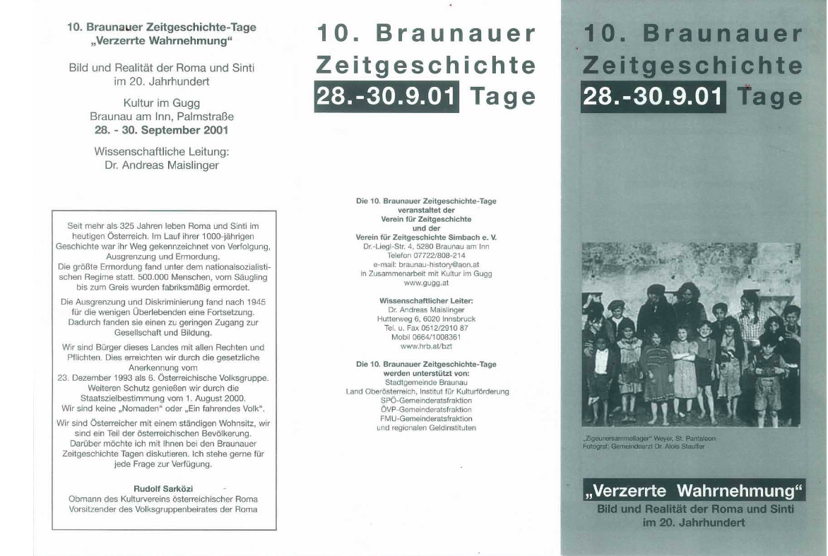 Die 10. Braunauer Zeitgeschichte-Tage fanden vom 28. bis 30. September 2001 im Kulturzentrum Gugg unter dem Titel „Verzerrte Wahrnehmung“ statt. Im Mittelpunkt standen Bild und Realität der Roma und Sinti im 20. Jahrhundert. Anlass war die lange Geschichte dieser Bevölkerungsgruppe, die seit mehr als 325 Jahren in Österreich lebt.