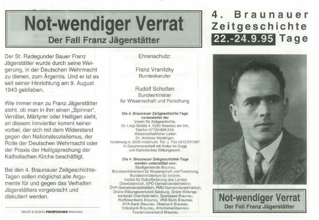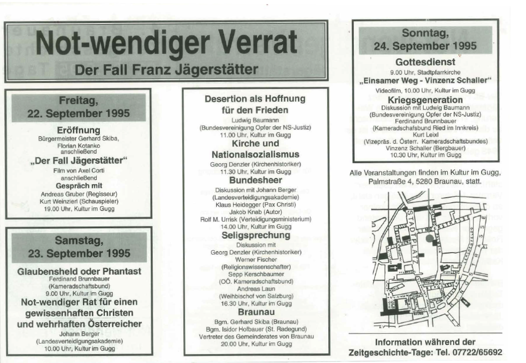 Prominent besetzt waren die 4. Braunauer Zeitgeschichtetage, die 1995 im Kulturzentrum Gugg stattfanden. Im Mittelpunkt stand der Fall des Bauern Franz Jägerstätter aus St. Radegund, der während des Zweiten Weltkriegs den Dienst bei der Deutschen Wehrmacht verweigerte und im August 1943 hingerichtet wurde.