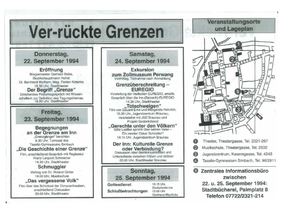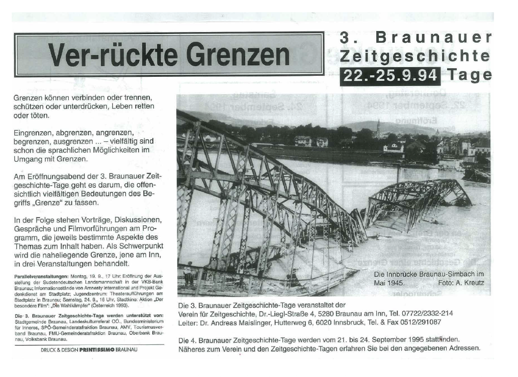 Grenzen als Trennlinie und Verbindung zugleich: Die Zeitgeschichtetage 1994 widmeten sich den „Ver-rückten Grenzen“ zwischen Braunau und Simbach – und darüber hinaus. Mit Vorträgen, Ausstellungen und historischen Perspektiven.