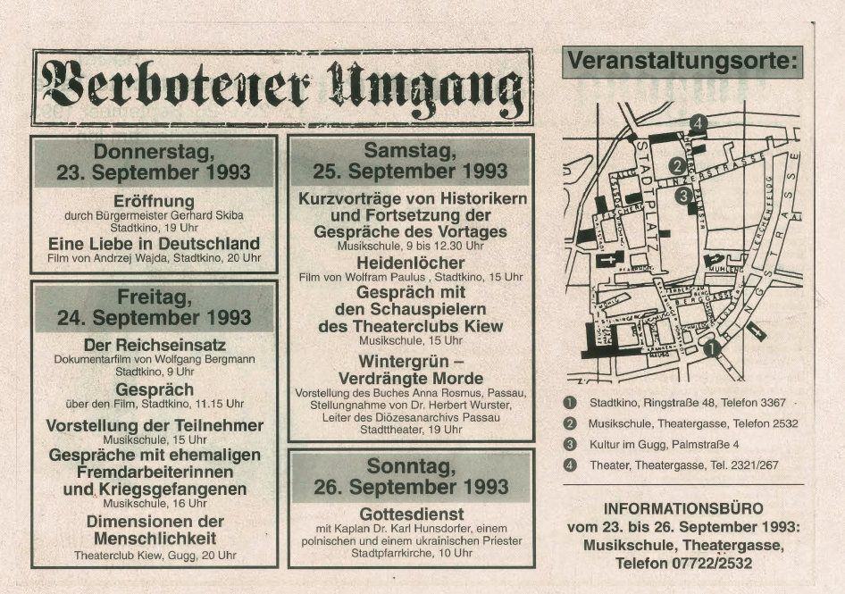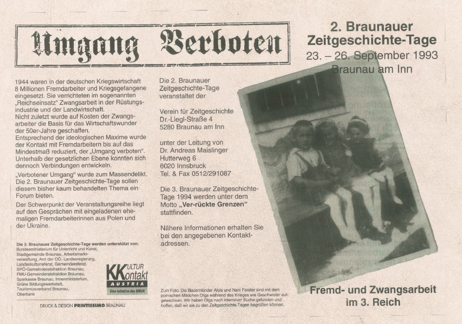 Die 2. Braunauer Zeitgeschichtetage vom 23. bis 26. September 1993 standen unter dem Thema „Verbotener Umgang. Fremd- und Zwangsarbeit im Dritten Reich“. Im Mittelpunkt stand die systematische Ausbeutung von Millionen Menschen, die während des Zweiten Weltkriegs in der deutschen Kriegswirtschaft Zwangsarbeit leisten mussten.